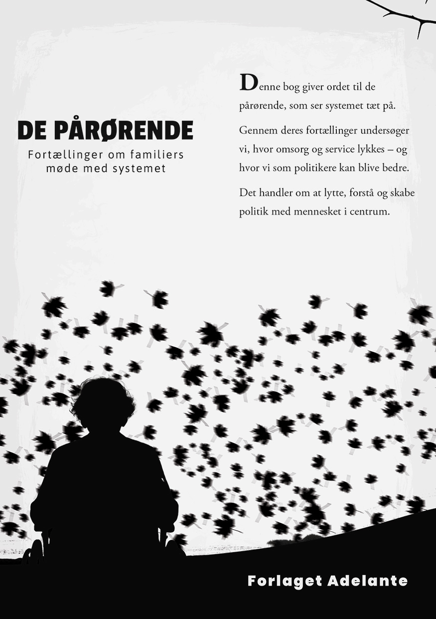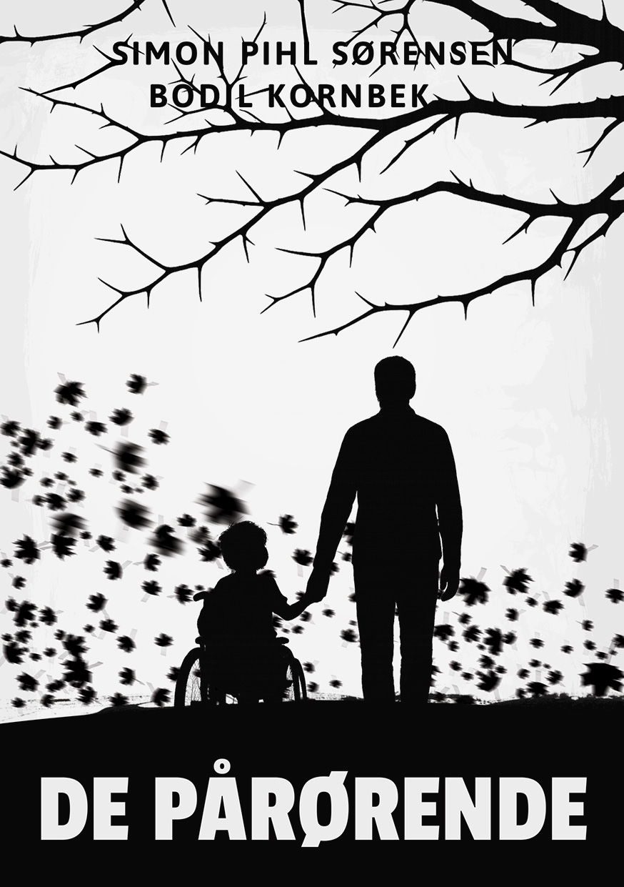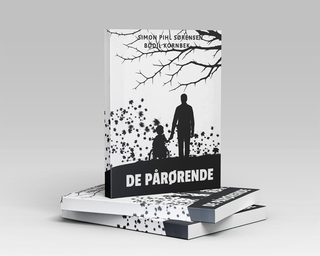 Designet landede i et sort-hvidt univers med silhuetter, der giver plads til fortolkning. På forsiden står et barn i kørestol og holder en voksen i hånden. På bagsiden en ældre i kørestol. En enkel måde at vise temaerne uden at gøre det dramatisk eller overtydeligt.